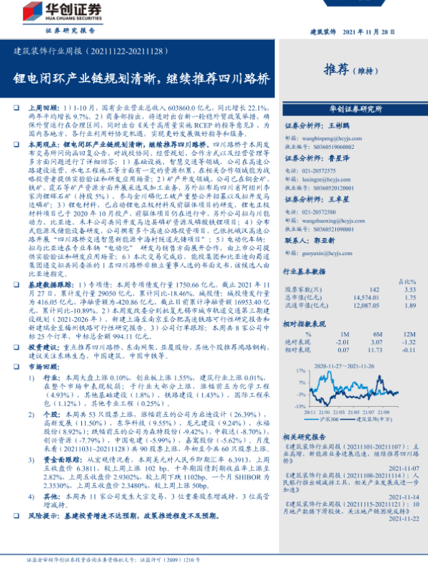 【华创证券】【20211128】建筑装饰行业周报:锂电闭环产业链规划清晰,继续推荐四川路桥-17页 行业研究