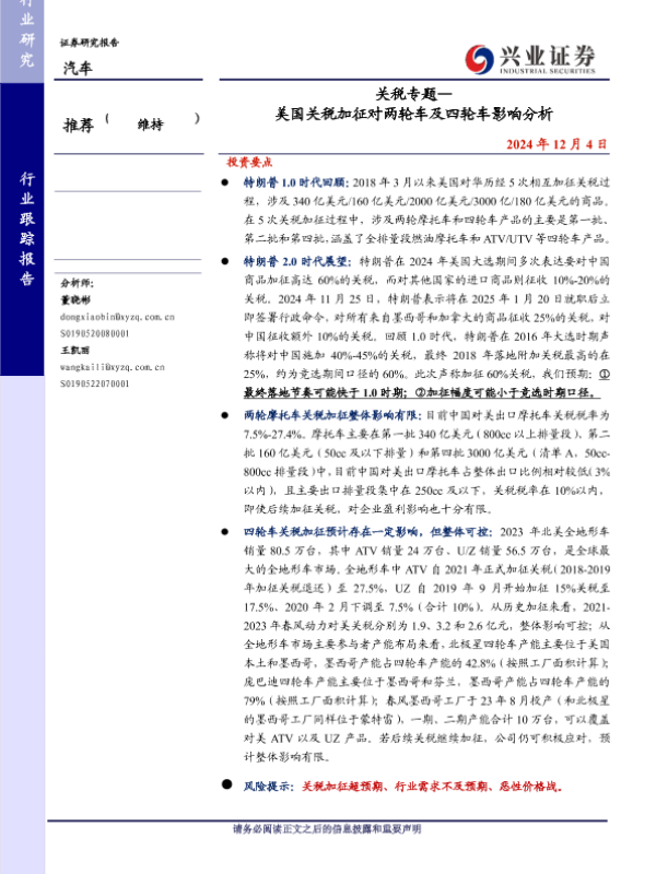 【兴业证券】【20241204】关税专题— 美国关税加征对两轮车及四轮车影响分析-20页 行业研究