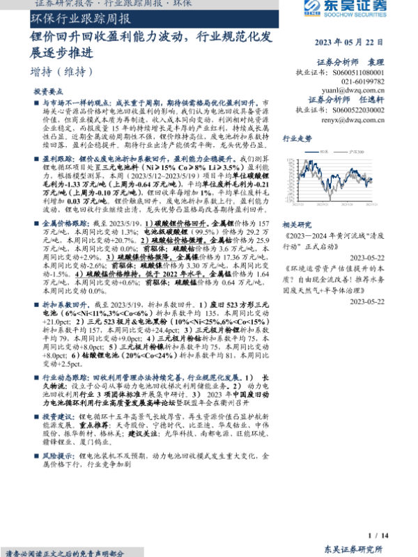 【东吴证券】【20230522】环保行业跟踪周报:锂价回升回收盈利能力波动,行业规范化发展逐步推进-14页 行业研究