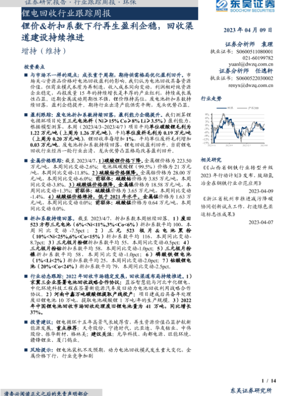 【东吴证券】【20230409】锂电回收行业跟踪周报:锂价&折扣系数下行再生盈利企稳,回收渠道建设持续推进-14页 行业研究