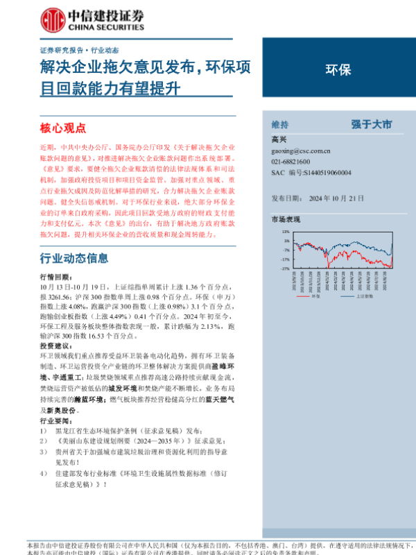 【中信建投证券】【20241021】2024年10月31日更新-【中信建投】环保行业:解决企业拖欠意见发布,环保项目回款能力有望提升-12页 行业研究