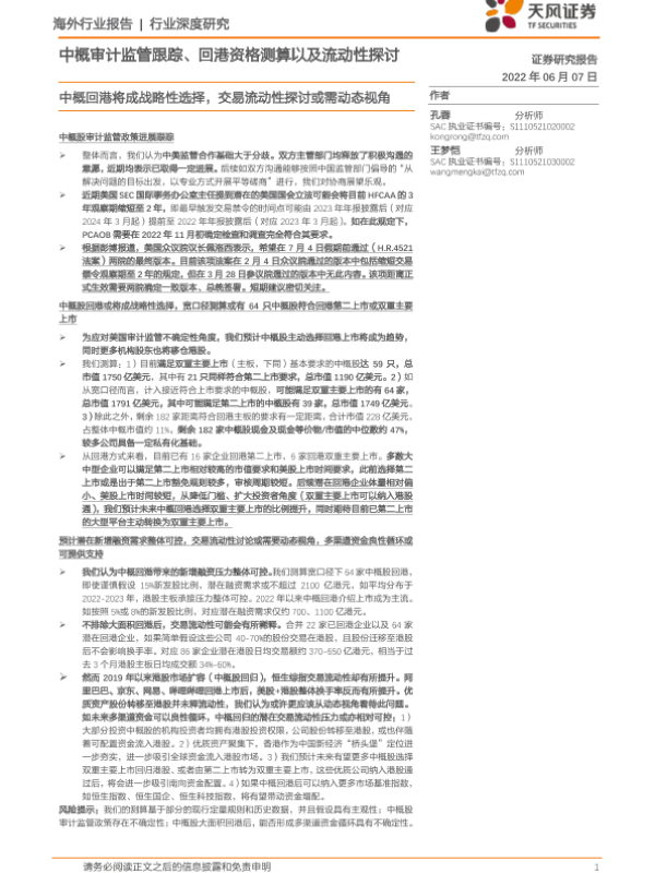 【天风证券】【20220607】中概审计监管跟踪、回港资格测算以及流动性探讨:中概回港将成战略性选择,交易流动性探讨或需动态视角-28页 行业研究