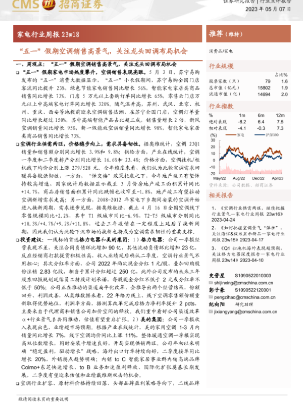 【海通证券】【20230507】20230507-招商证券-家电行业周报23w18:“五一”假期空调销售高景气,关注龙头回调布局机会-17页 行业研究