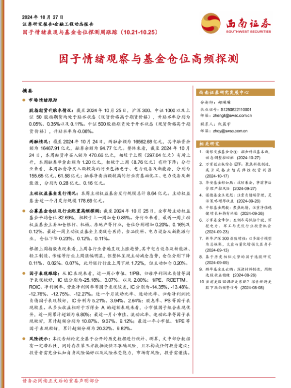 【西南证券】【20241027】因子情绪表现与基金仓位探测周跟踪:因子情绪观察与基金仓位高频探测-14页 行业研究