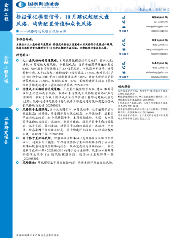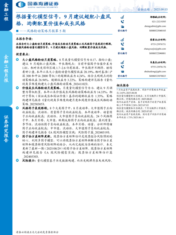 【国泰海通证券】【202509】风格轮动策略月报第5期:根据量化模型信号,9月建议超配小盘风格,均衡配置价值和成长风格-17页 证券期货研究报告
