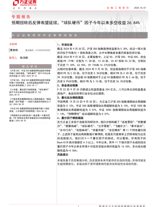 【方正证券】【20241007】专题报告:预期扭转后反弹有望延续,“球队硬币”因子今年以来多空收益26.84%-15页 行业研究