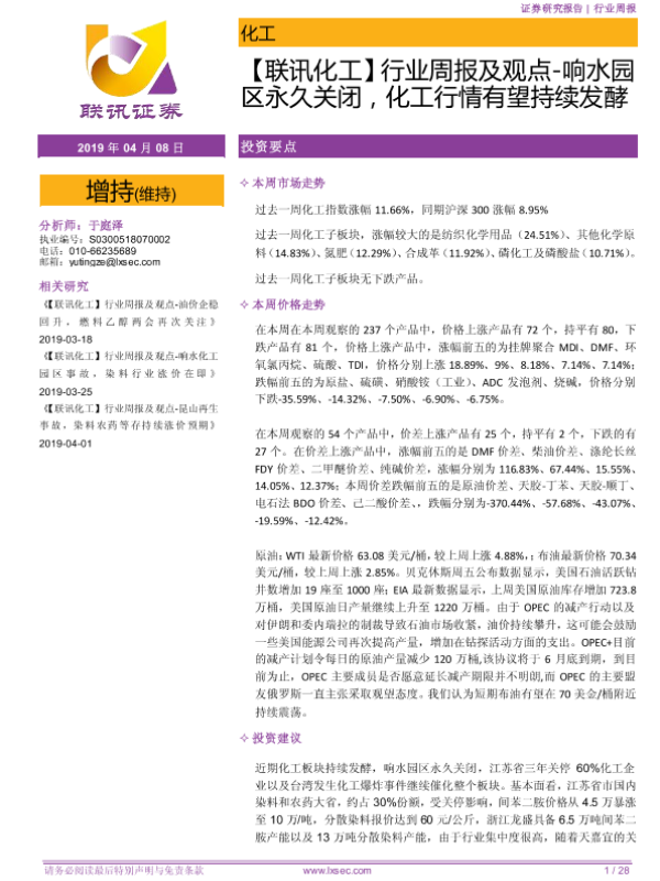 【粤开证券】【20190408】行业周报及观点-响水园区永久关闭,化工行情有望持续发酵-28页 证券期货研究报告