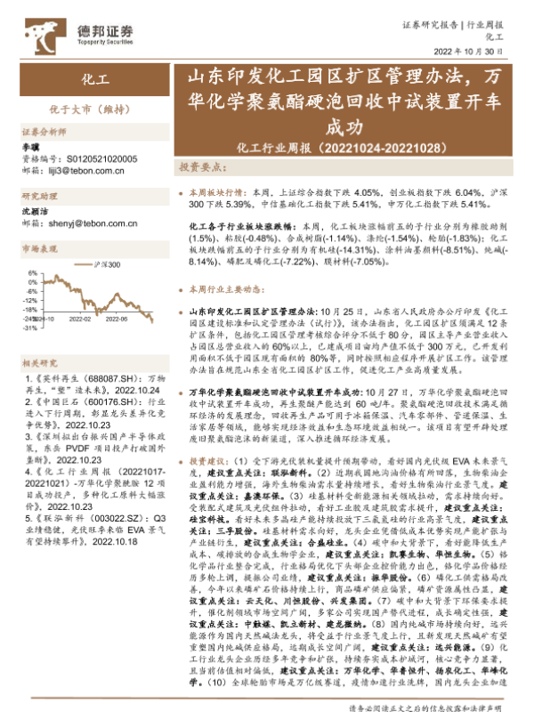 【德邦证券】【20221030】化工行业周报:山东印发化工园区扩区管理办法,万华化学聚氨酯硬泡回收中试装置开车成功-26页 行业研究