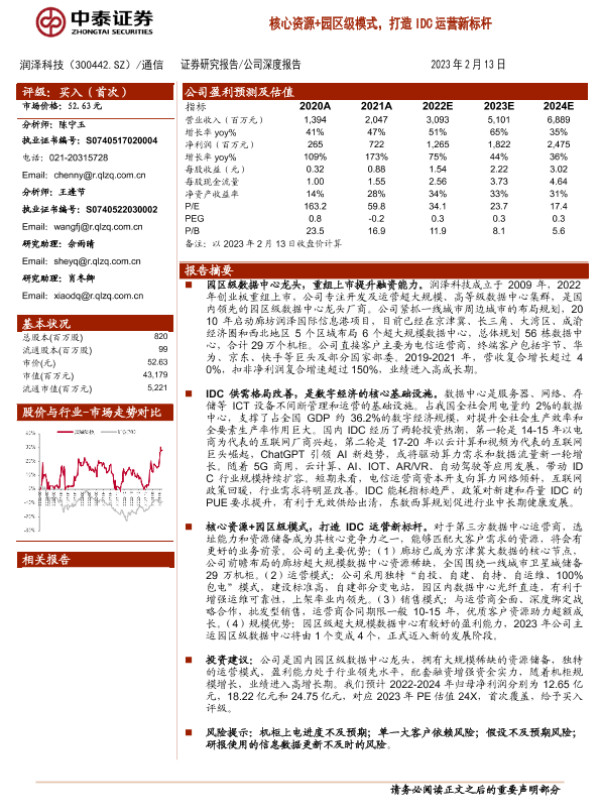 【中泰证券】【20230213】中泰证券-润泽科技-核心资源+园区级模式,打造IDC运营新标杆-36页 行业研究