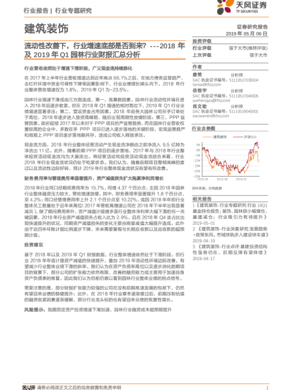 【天风证券】【20190506】建筑装饰行业专题研究:2018年及2019年Q1园林行业财报汇总分析-流动性改善下,行业增速底部是否到来?-16页 行业研究