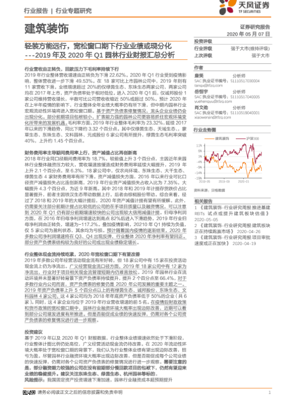 【天风证券】【20200507】2019年及2020年Q1园林行业财报汇总分析-20页 行业研究