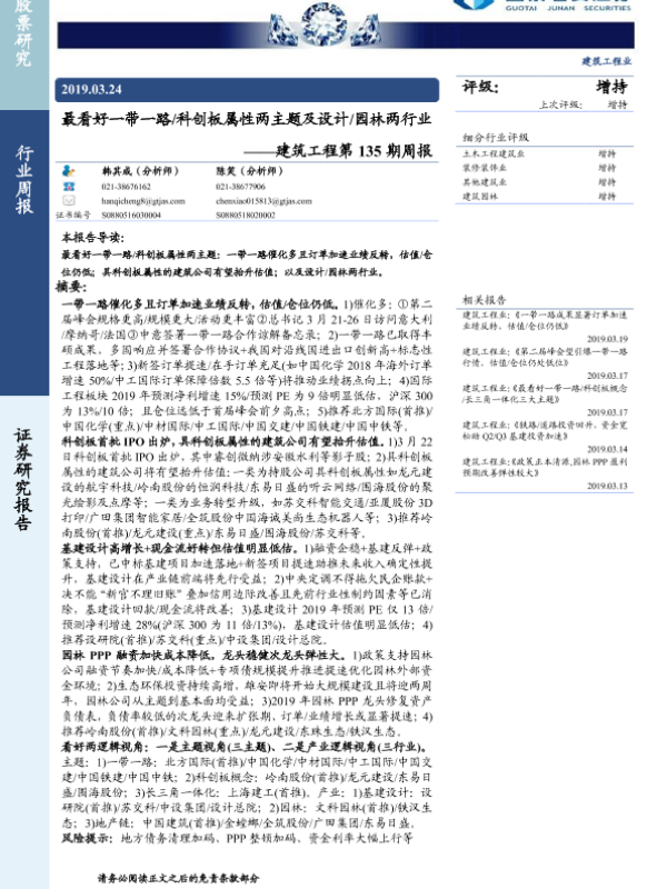 【国泰君安证券】【20190324】最看好一带一路/科创板属性两主题及设计/园林两行业-9页 行业研究