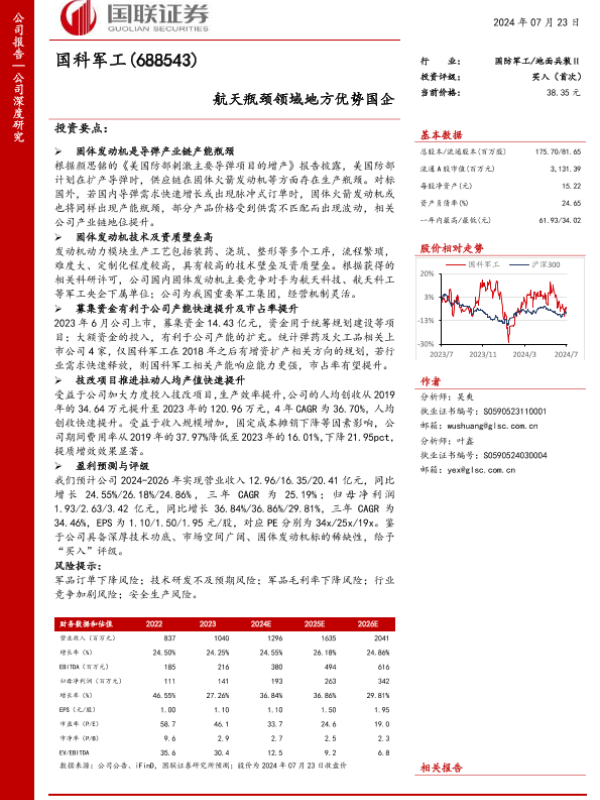 【国联证券】【20240723】国科军工(688543)航天瓶颈领域地方优势国企-24页 行业研究