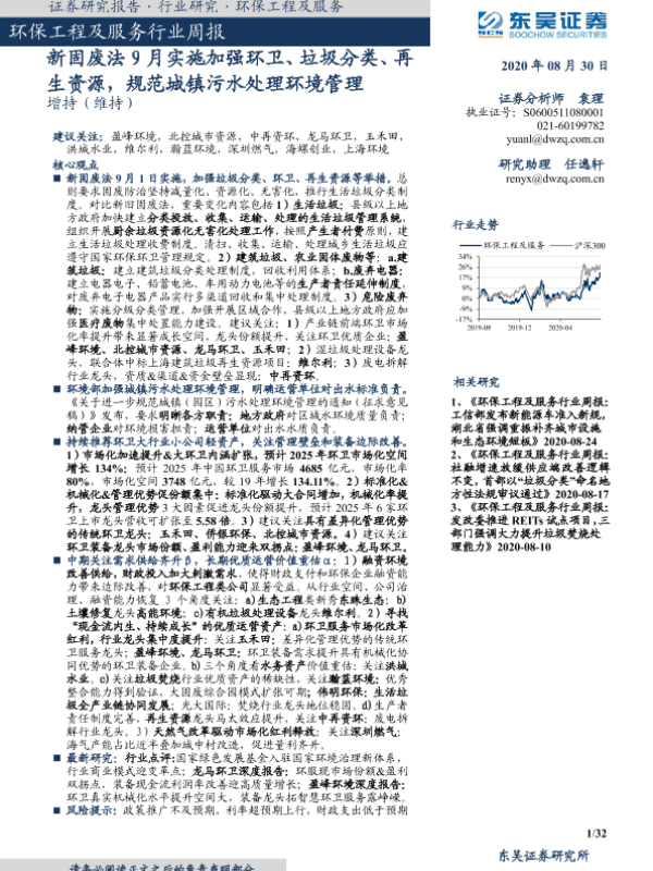 【东吴证券】【20200830】环保工程及服务行业周报:新固废法9月实施加强环卫、垃圾分类、再生资源,规范城镇污水处理环境管理-32页 行业研究