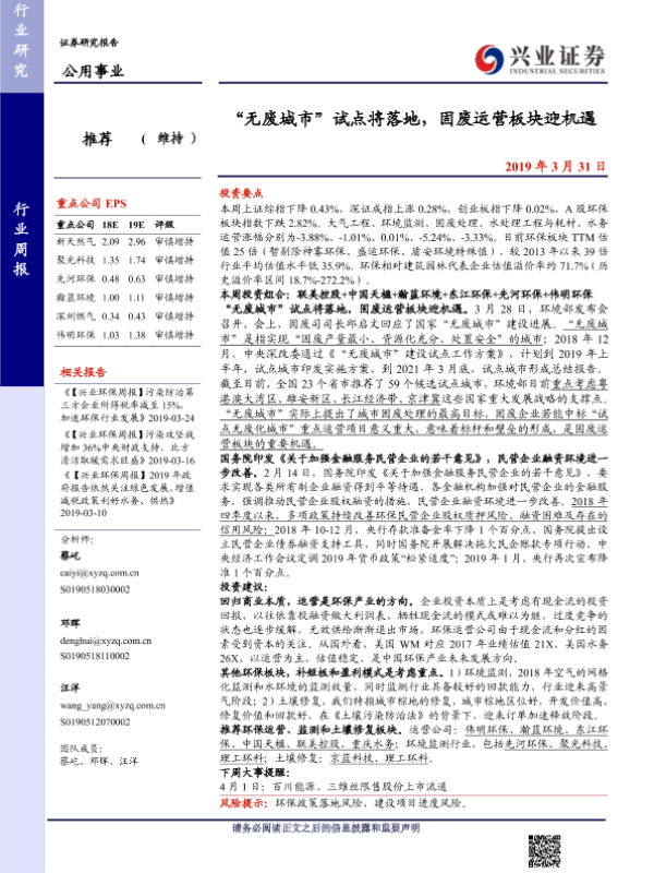 【兴业证券】【20190331】公用事业行业周报:“无废城市”试点将落地,固废运营板块迎机遇-11页 行业研究