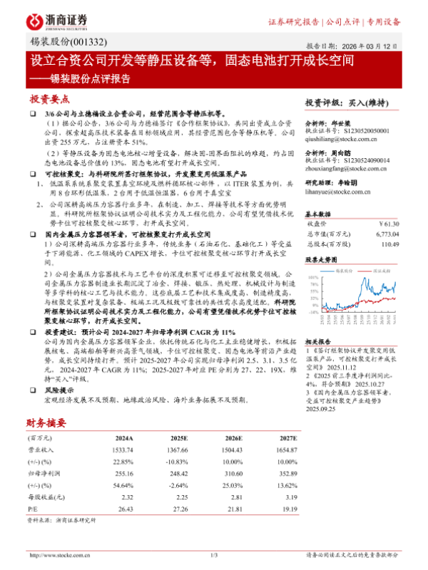 【浙商证券】【2025】设立合资公司开发等静压设备等,固态电池打开成长空间——锡装股份点评报告-3页 证券期货研究报告
