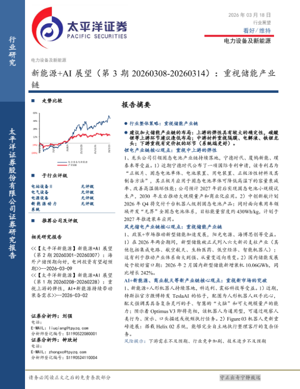 【太平洋证券】【202603】新能源+A I展望(第 3期 20260308-20260314):重视储能产业链-15页 证券期货研究报告
