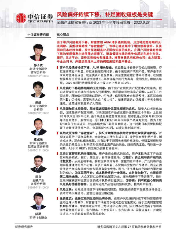 【中信证券】【20230627】金融产业财富管理行业2023年下半年投资策略:风险偏好持续下移,补足固收短板是关键-28页 行业研究