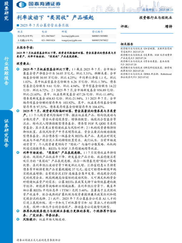 【国泰海通证券】【20250811】2025年7月公募资管业务月报:利率波动下“类固收”产品崛起-11页 证券期货研究报告