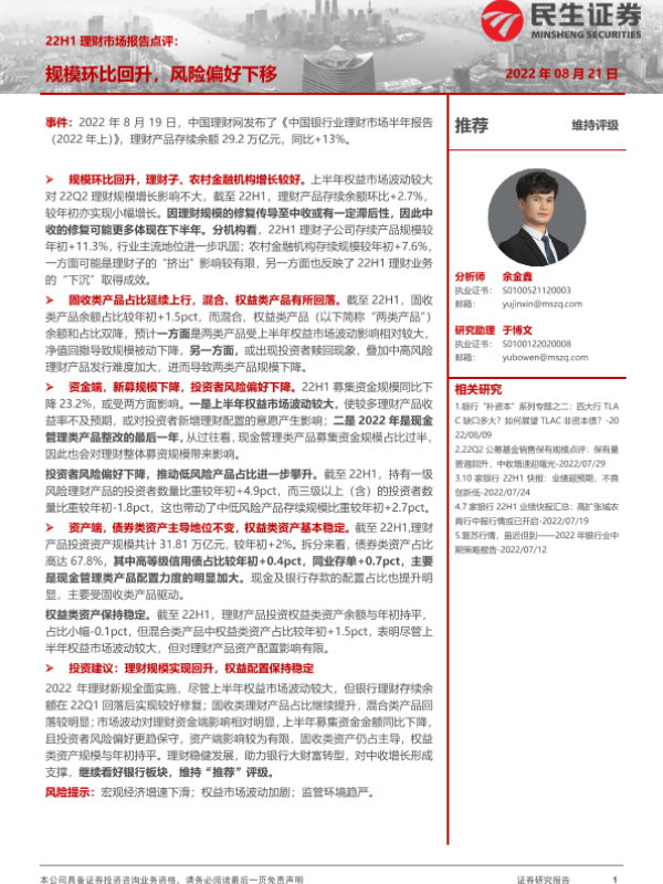 【民生证券】【20220821】22H1理财市场报告点评:规模环比回升,风险偏好下移-10页 行业研究