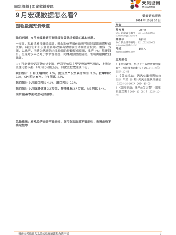 【天风证券】【20241010】固收数据预测专题:9月宏观数据怎么看?-20页 行业研究