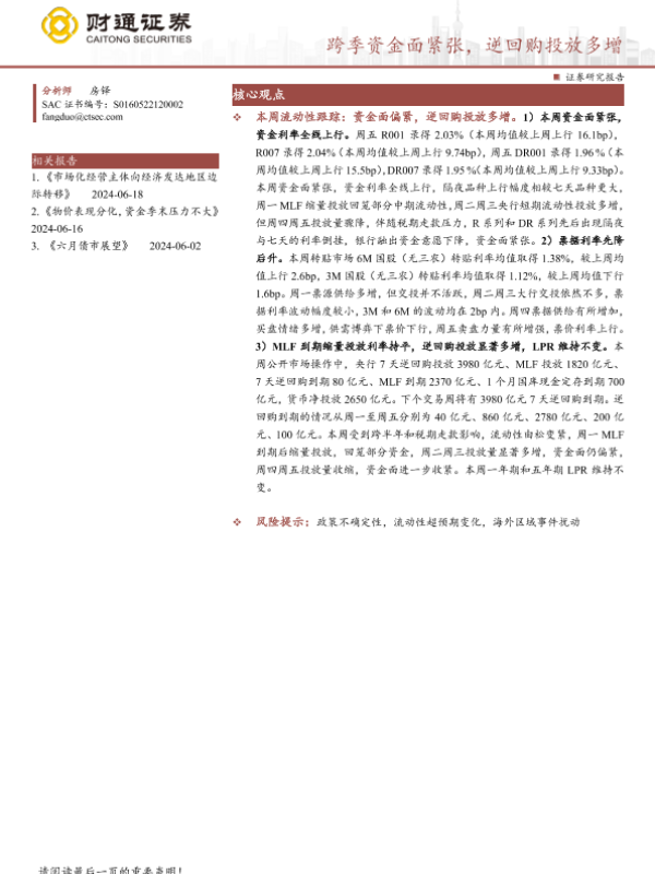 【财通证券】【20240623】固收定期报告:跨季资金面收紧,逆回购投放多增-14页 行业研究