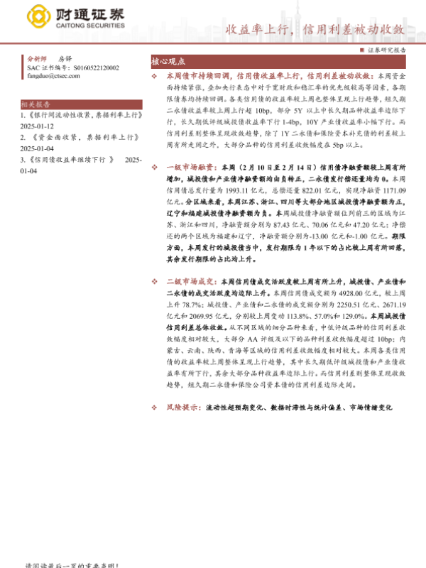 【财通证券】【20250217】固收定期报告:收益率上行,信用利差被动收敛-10页 行业研究