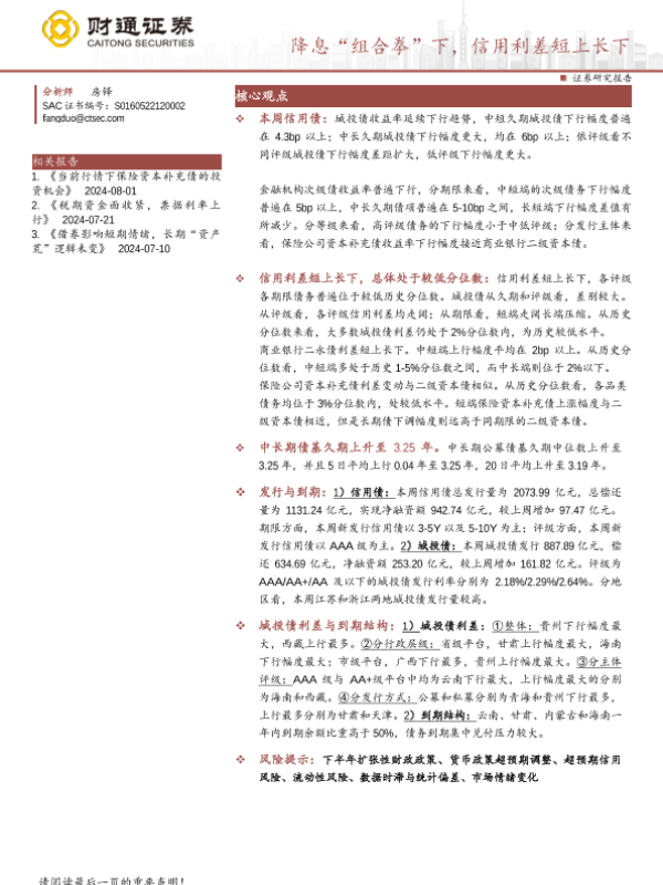 【财通证券】【20240805】降息“组合拳”下,信用利差短上长下-15页 行业研究