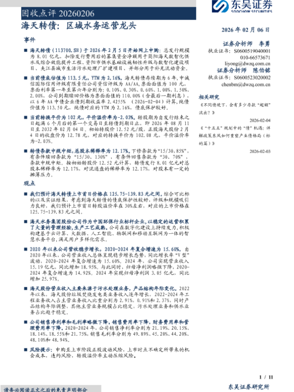 【东吴证券】【202602】海天转债:区域水务运营龙头-11页 证券期货研究报告