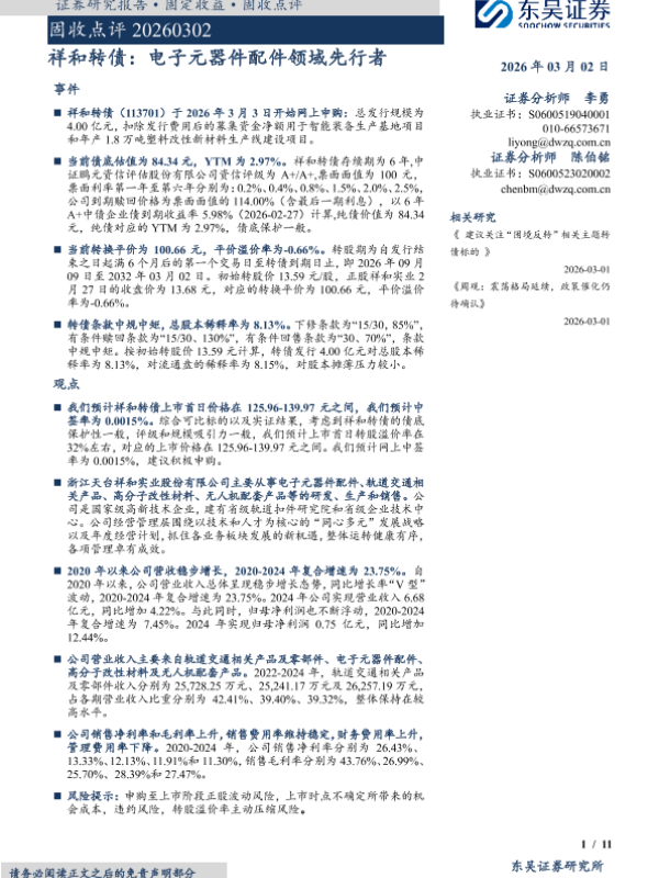 【东吴证券】【202603】祥和转债:电子元器件配件领域先行者-11页 证券期货研究报告