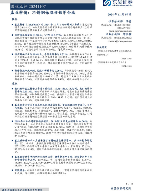 【东吴证券】【20241107】固收点评:嘉益转债,不锈钢保温杯领军企业-11页 行业研究