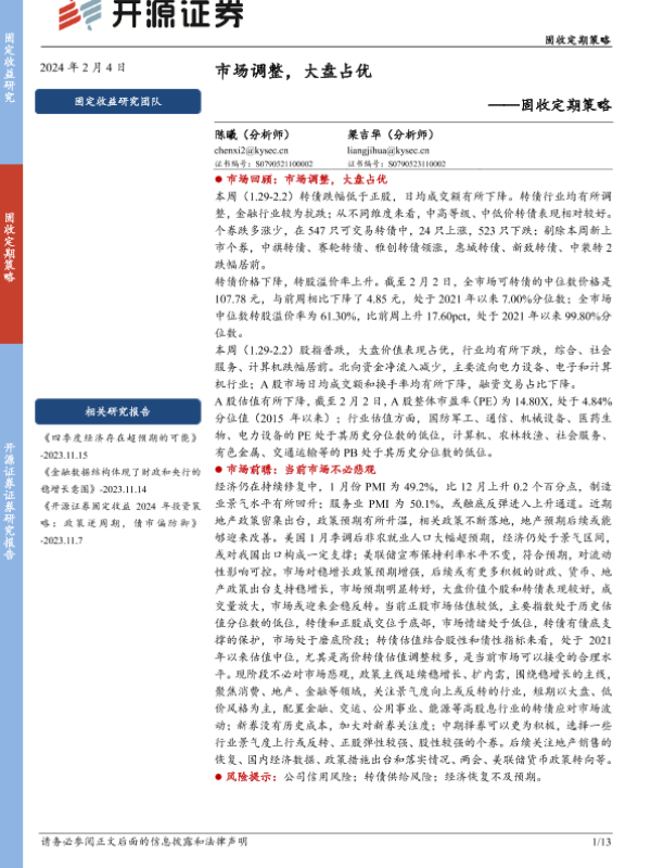 【开源证券】【20240204】市场调整,大盘占优——固收定期策略-13页 行业研究
