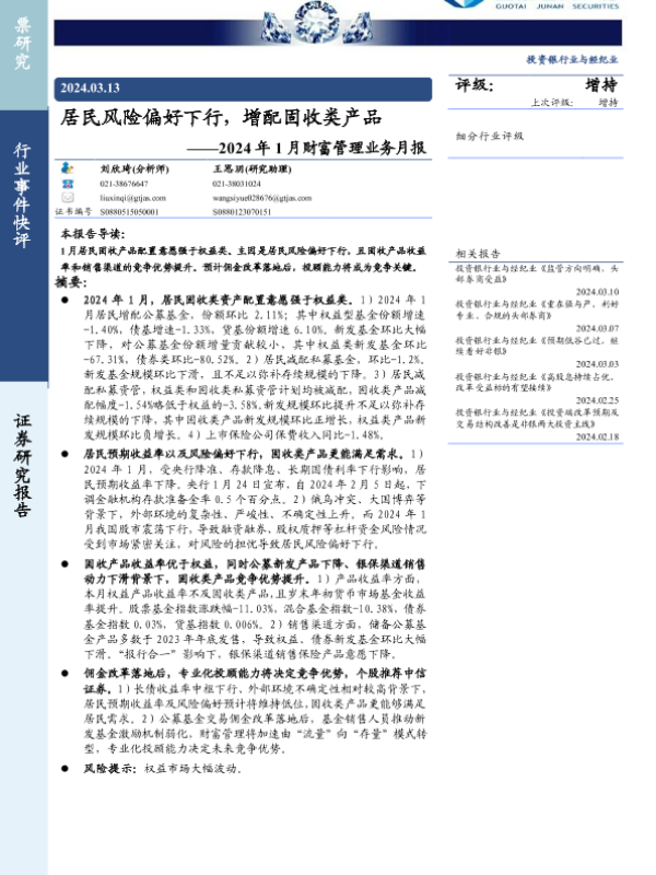 【国泰君安证券】【202401】投资银行业与经纪业行业2024年1月财富管理业务月报:居民风险偏好下行,增配固收类产品-14页 行业研究