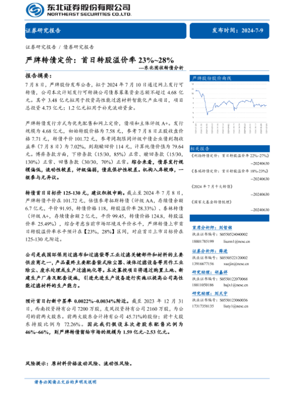 【东北证券】【20240709】固收转债分析:严牌转债定价,首日转股溢价率23%~28%-11页 行业研究