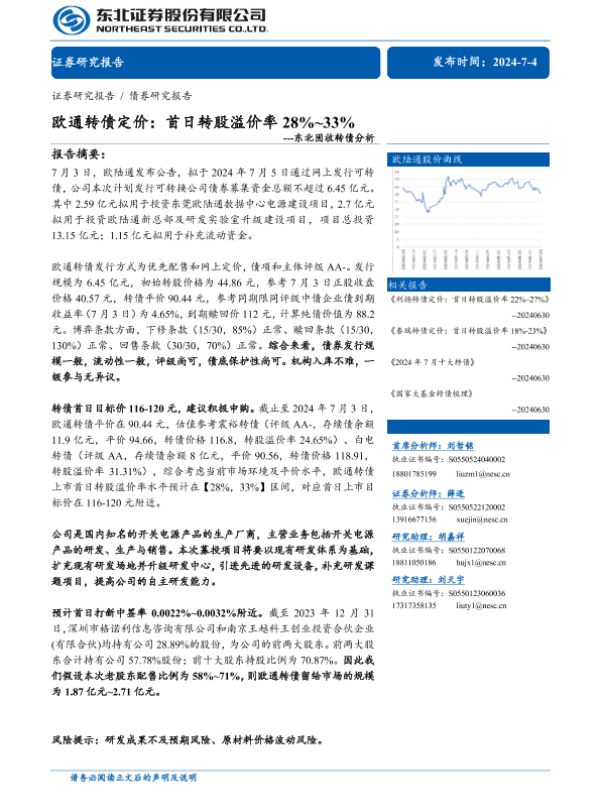 【东北证券】【20240704】固收转债分析:欧通转债定价建议,首日转股溢价率28%-33%-12页 行业研究