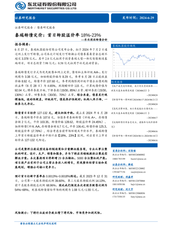 【东北证券】【20240629】固收转债分析:泰瑞转债定价,首日转股溢价率18%-23%-11页 行业研究