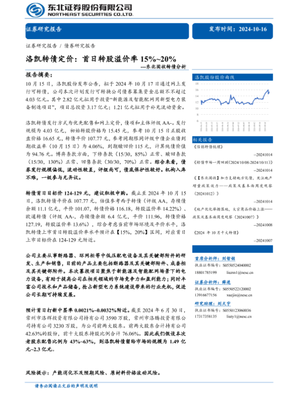 【东北证券】【20241016】固收转债分析:洛凯转债定价,首日转股溢价率15%-20%-11页 行业研究