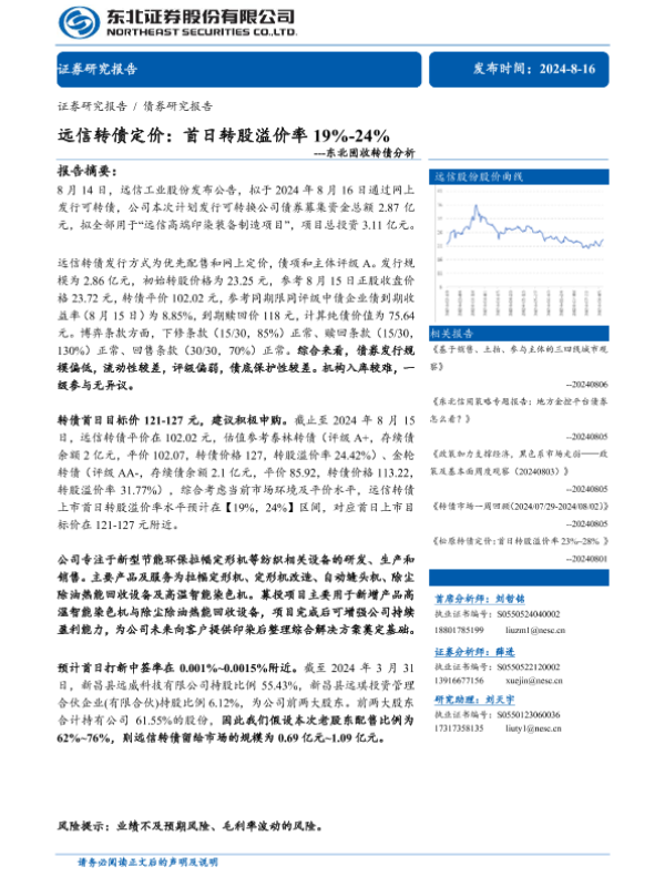 【东北证券】【20240816】固收转债分析-远信转债定价:首日转股溢价率19%-24%-11页 行业研究