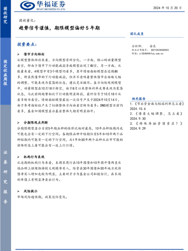 【华福证券】【20241020】固收量化:趋势信号谨慎,期限模型偏好5年期-16页 行业研究