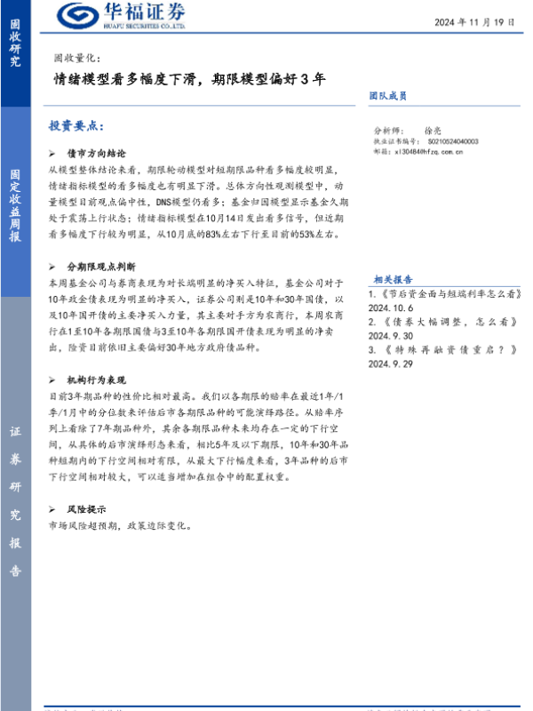 【华福证券】【20241119】固收量化:情绪模型看多幅度下滑,期限模型偏好3年-16页 行业研究