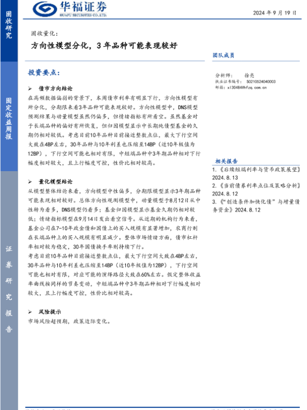 【华福证券】【20240919】固收量化:方向性模型分化,3年品种可能表现较好-16页 行业研究
