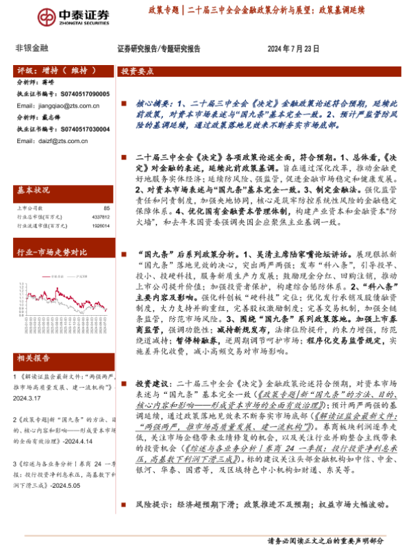 【中泰证券】【20240723】非银金融行业政策专题│二十届三中全会金融政策分析与展望:政策基调延续-26页 行业研究
