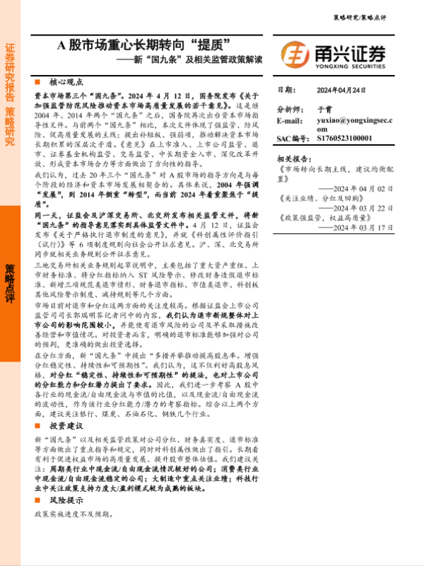 【甬兴证券】【20240424】新“国九条”及相关监管政策解读:A股市场重心长期转向“提质”-12页 行业研究