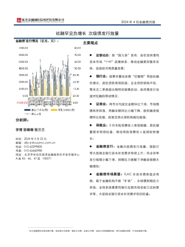 【东方金诚】【20240522】2024年4月金融债月报:社融罕见负增长,次级债发行放量-10页 行业研究