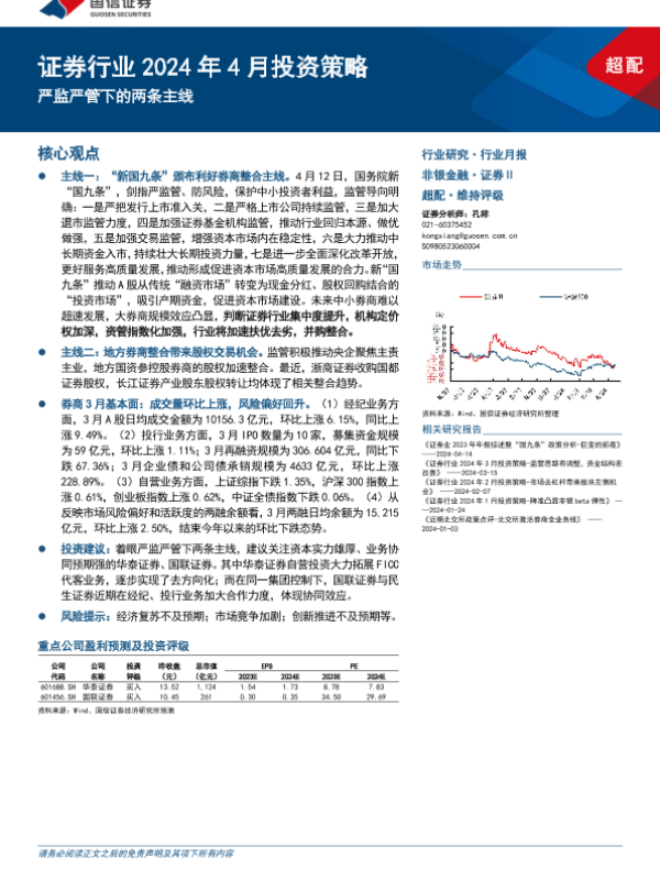 【国信证券】【20240421】证券行业2024年4月投资策略:严监严管下的两条主线-11页 行业研究