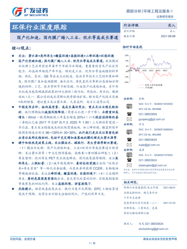 【广发证券】【20210808】环保行业深度跟踪:国产化加速,国内膜厂踏入工业、饮水等高成长赛道-10页 行业研究