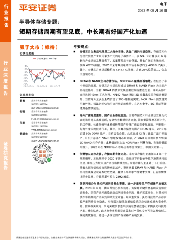 【平安证券】【20230816】电子行业半导体存储专题:短期存储周期有望见底,中长期看好国产化加速-36页 行业研究