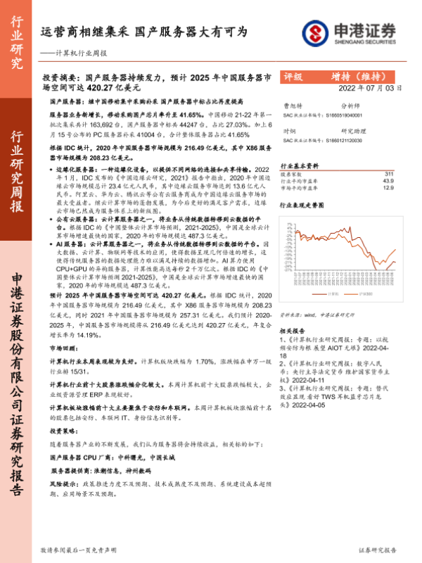 【申港证券】【20220703】计算机行业周报:运营商相继集采 国产服务器大有可为-10页 行业研究