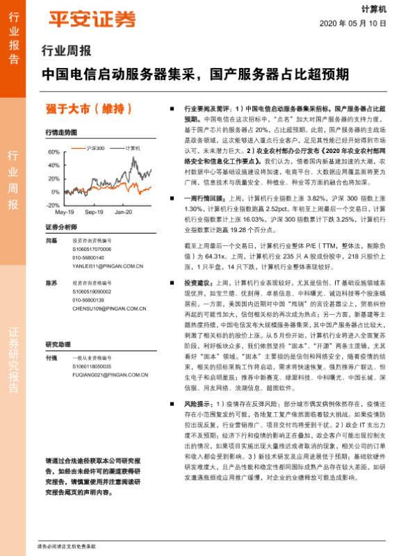 【平安证券】【20200510】20200510-平安证券-计算机行业周报:中国电信启动服务器集采,国产服务器占比超预期-5页 行业研究