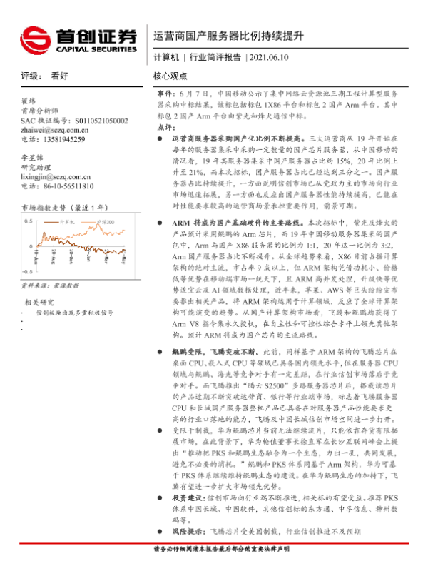 【首创证券】【20210610】计算机行业简评报告:运营商国产服务器比例持续提升-3页 行业研究